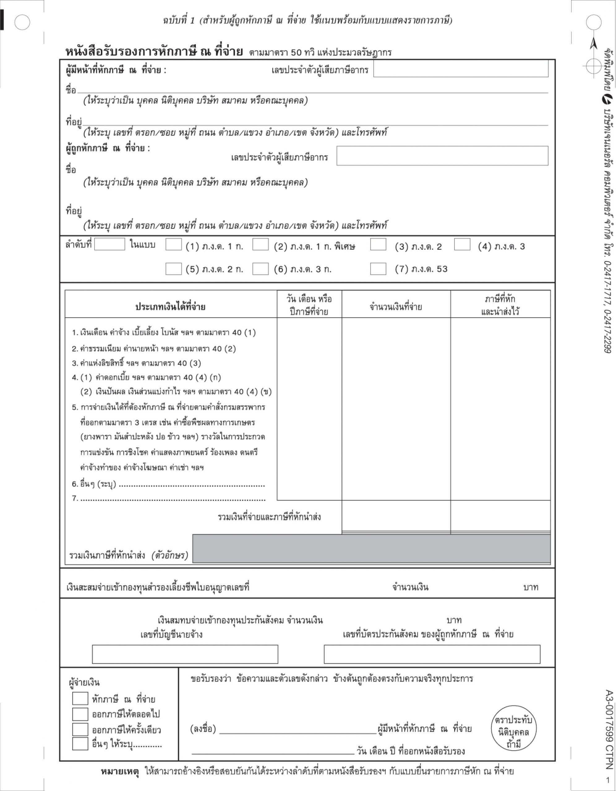 หนังสือรับรองการหักภาษี ณ ที่จ่าย ขนาด 7″ x 9″ชนิด 4ชั้น พิมพ์1 สี(สีดำ)